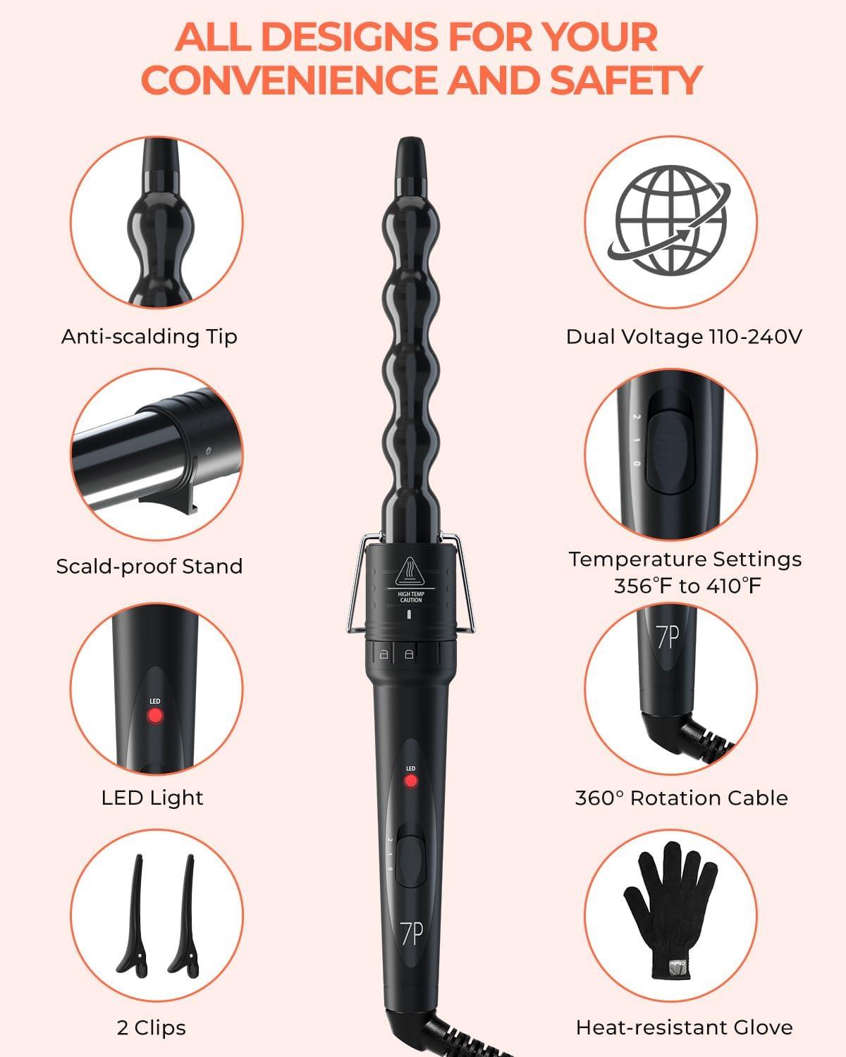 5-in-1 Curling Wand Set: Get the gorgeous hair you've always wanted without running to the salon every week! You can do almost anything with the 5 different sized barrels (0.35-0.7inch, 0.7-1inch, 1inch, 1-1.25inch and 1.25inch). Plus, universal 110v-240v dual voltage, 2 clips, heat-resistant glove and the 360° swivel cord make it travel-friendly, safe and convenient to use