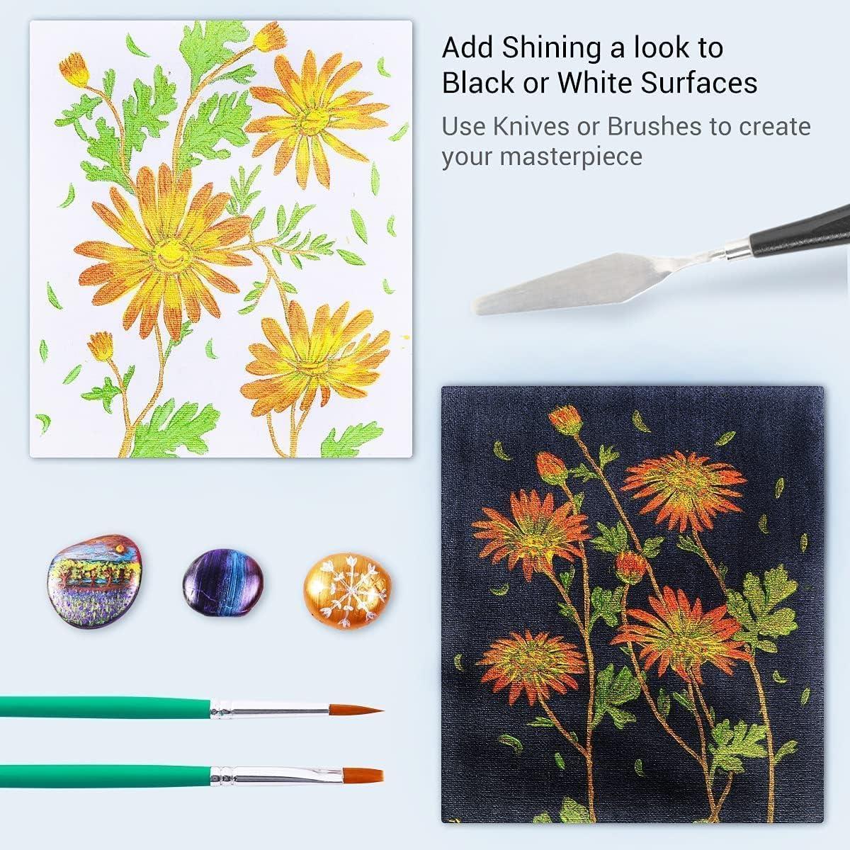 24 metallic colors, shiny and smooth – Ready for creativity time? Jump into this acrylic painting set of 24 shiny paint colors! With this rainbow of glitter colors that will make what you create truly shine! These smooth metallic paints also add a touch of style to your artwork.