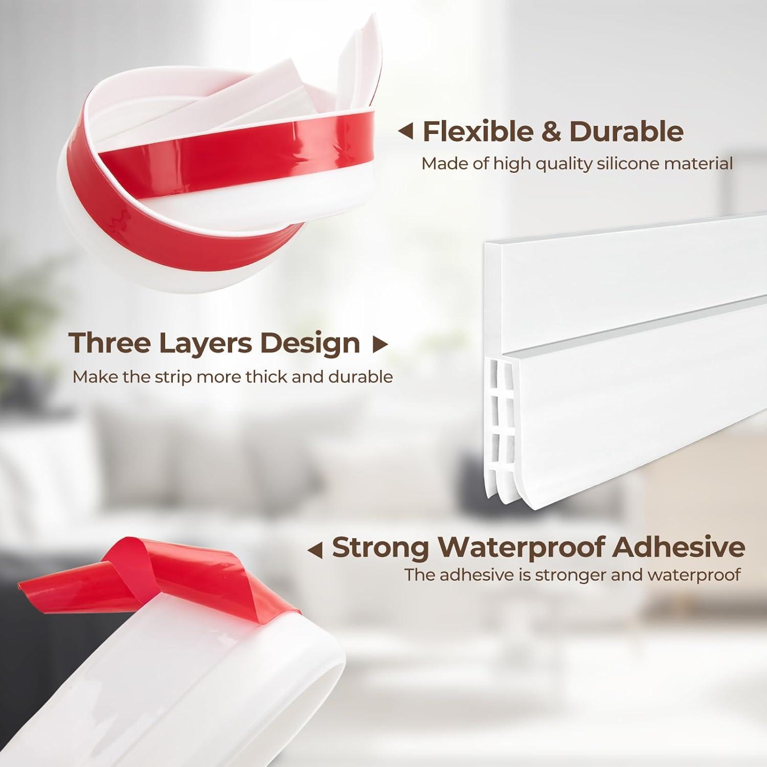 Quality Silicone: 39″L x 2″W. Flexible, bendable, water-resistant, scratch-proof silicone. Safe for all floors. Fits doors, windows, cabinets, furniture, bathrooms