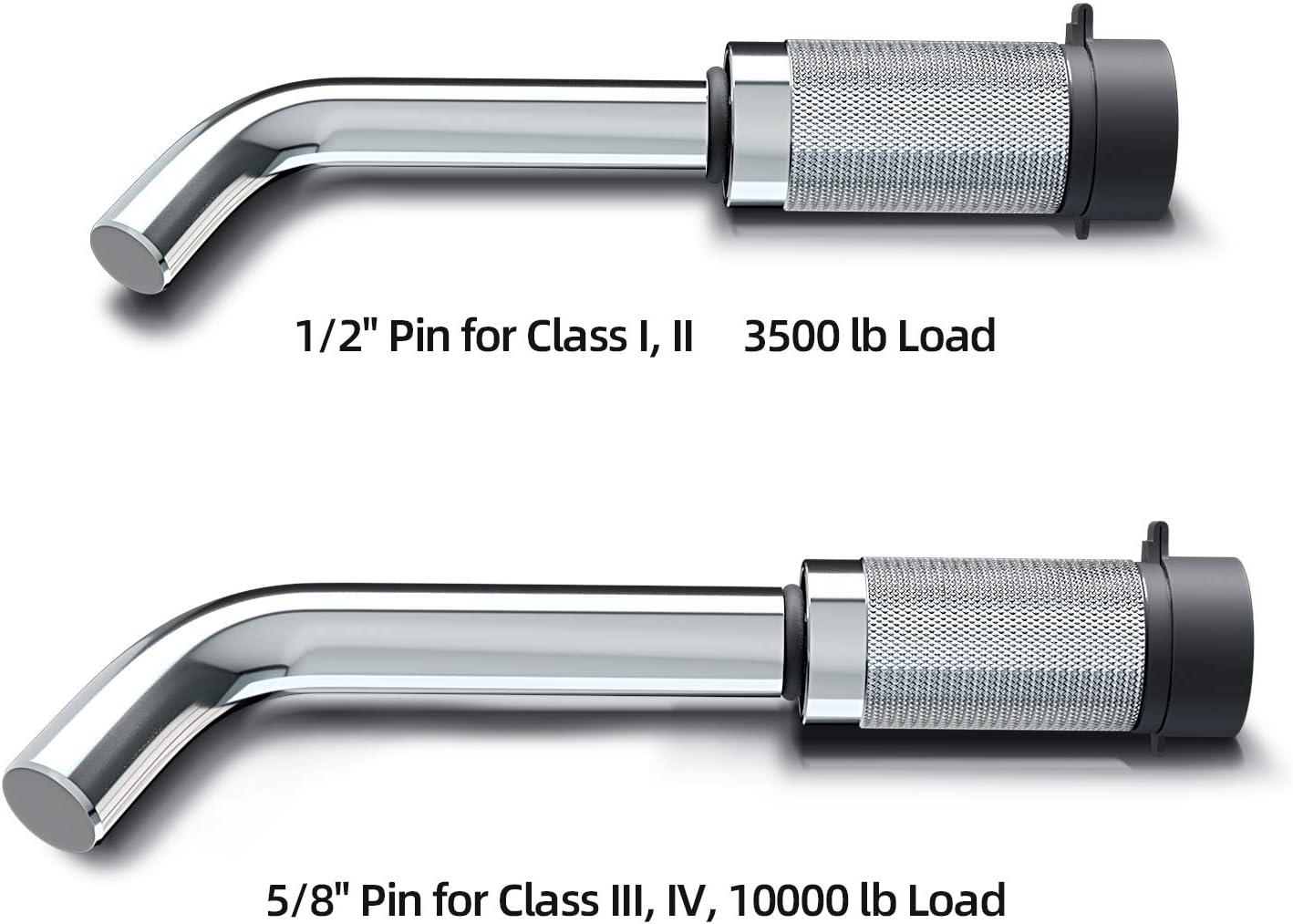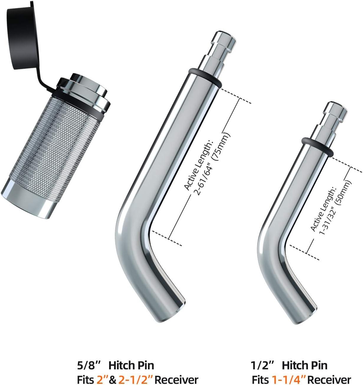 Fits Class I, II, III, IV Receivers: 1/2 ” pin is ideal for a 1-1 / 4″ receiver length of 1-31/32″ usable length; 5/8″ pin is perfect for a 2 inch or 2-1/2 ” trailer receiver usable length of 2-61/64″.
