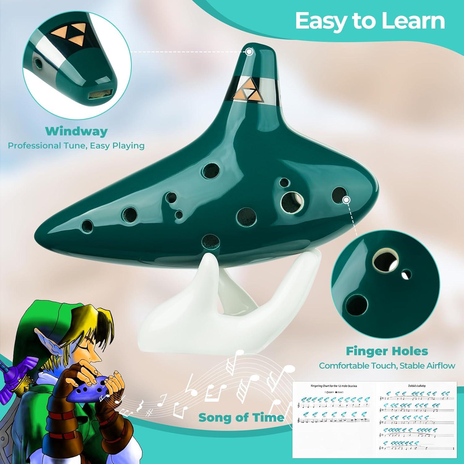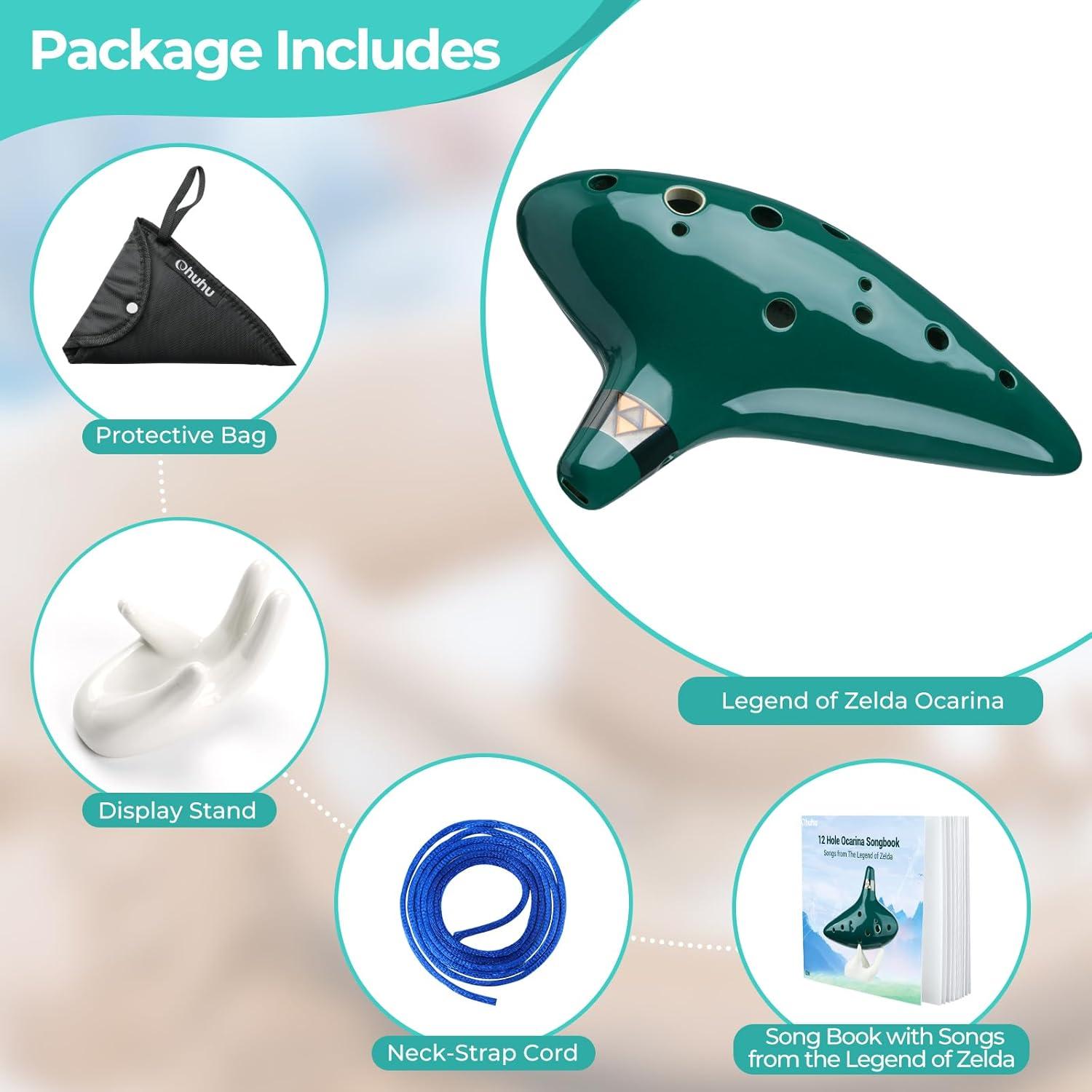 All-in-One Ocarina Set: Included in this deluxe set are a 12-hole ocarina, a song book, a neck-strap cord, a wipe and a protective bag. You'll love the neck strap, which prevents it from falling, as well as the protective pouch to keep it scratch-free. Simple songs are included in the songbook.