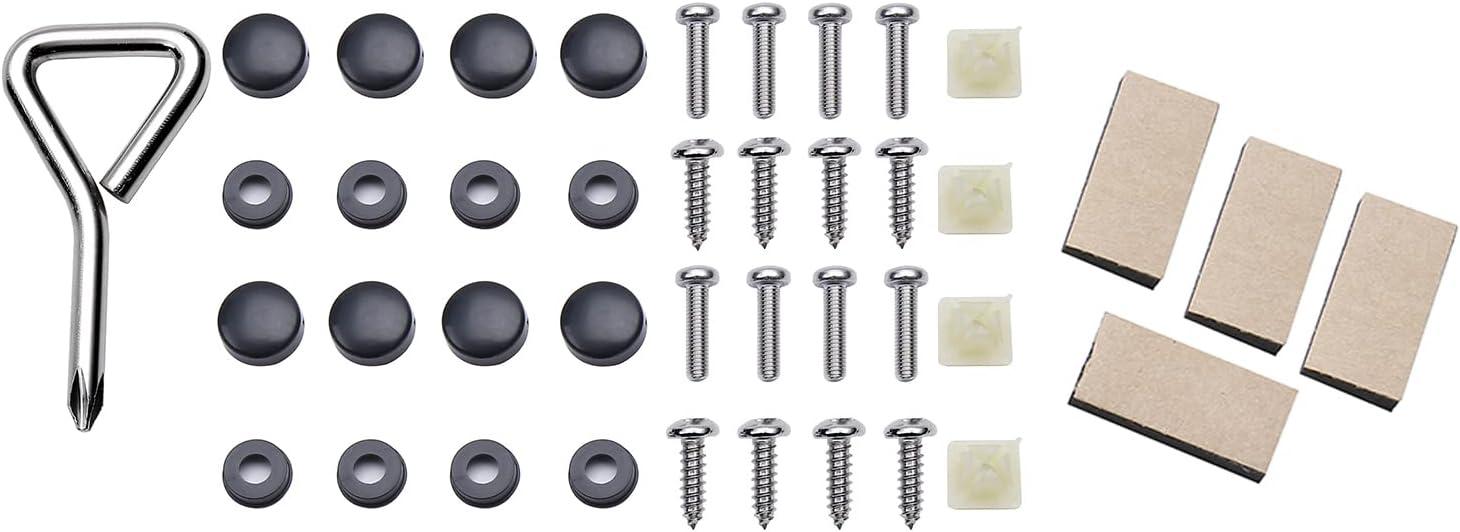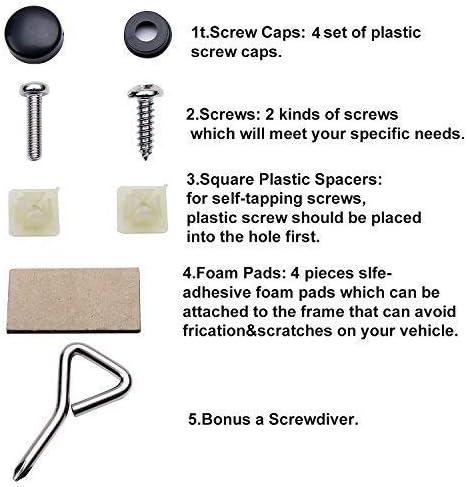 Hardware Included: All accessories needed are included (Screws, Screw Caps, Screw Fasteners, Screwdriver). 8 piece self-adhesive foam pads can be attached to the back corners of the frame that can avoid friction and scratches on your vehicle.