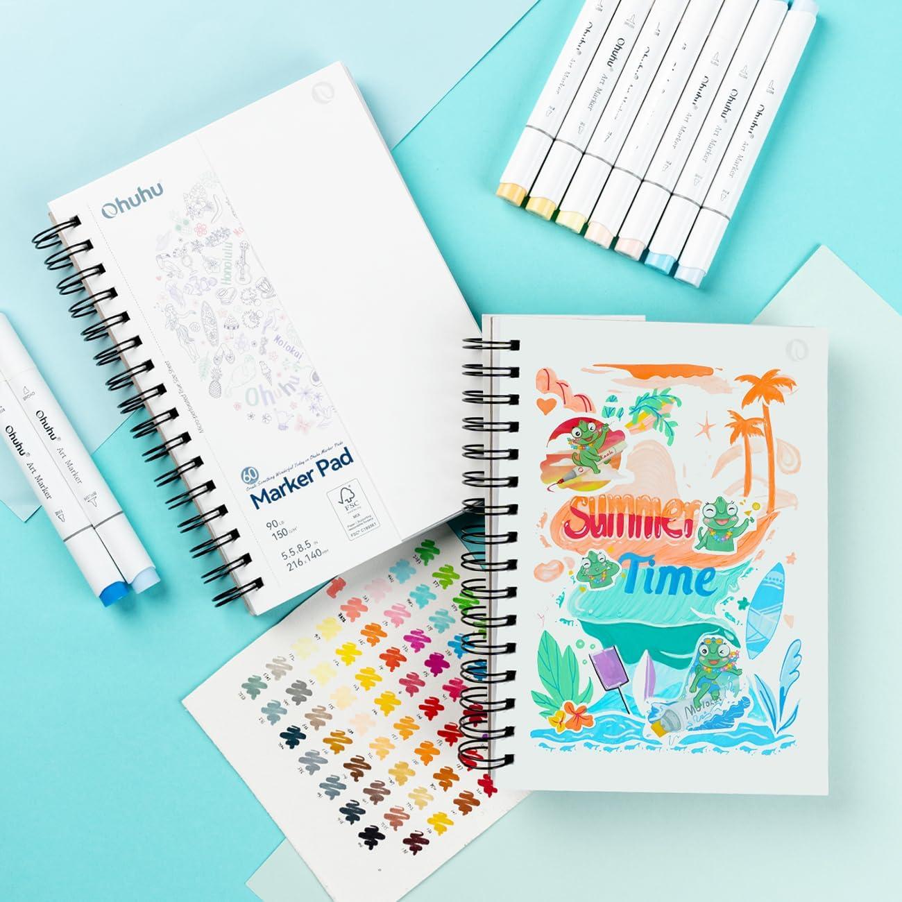 Ohuhu Double-Sided Marker Pad Art Sketchbook Bleedproof – 7″x10″ Large Paper Size – 90 lb/150 gsm Smooth Drawing Paper – 60 Sheets/120 Pages – Spiral Bound Sketching Book for Alcohol Markers(5.5×8.5)