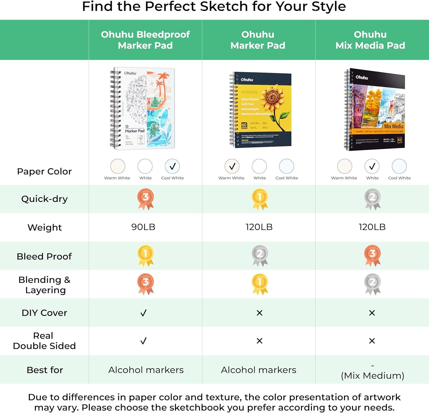 High-Quality Drawing Paper – Marker paper made from 90 lb/150 gsm FSC-certified paper. Ohuhu's marker book is durable and sustainable. Despite its unique design that tones down paper whiteness, the smooth and even paper surface pairs exceptionally well with Ohuhu alcohol markers. While ink drying time may vary slightly compared to regular paper, rest assured, even budding beginners don't need to fret about ink bleeding.