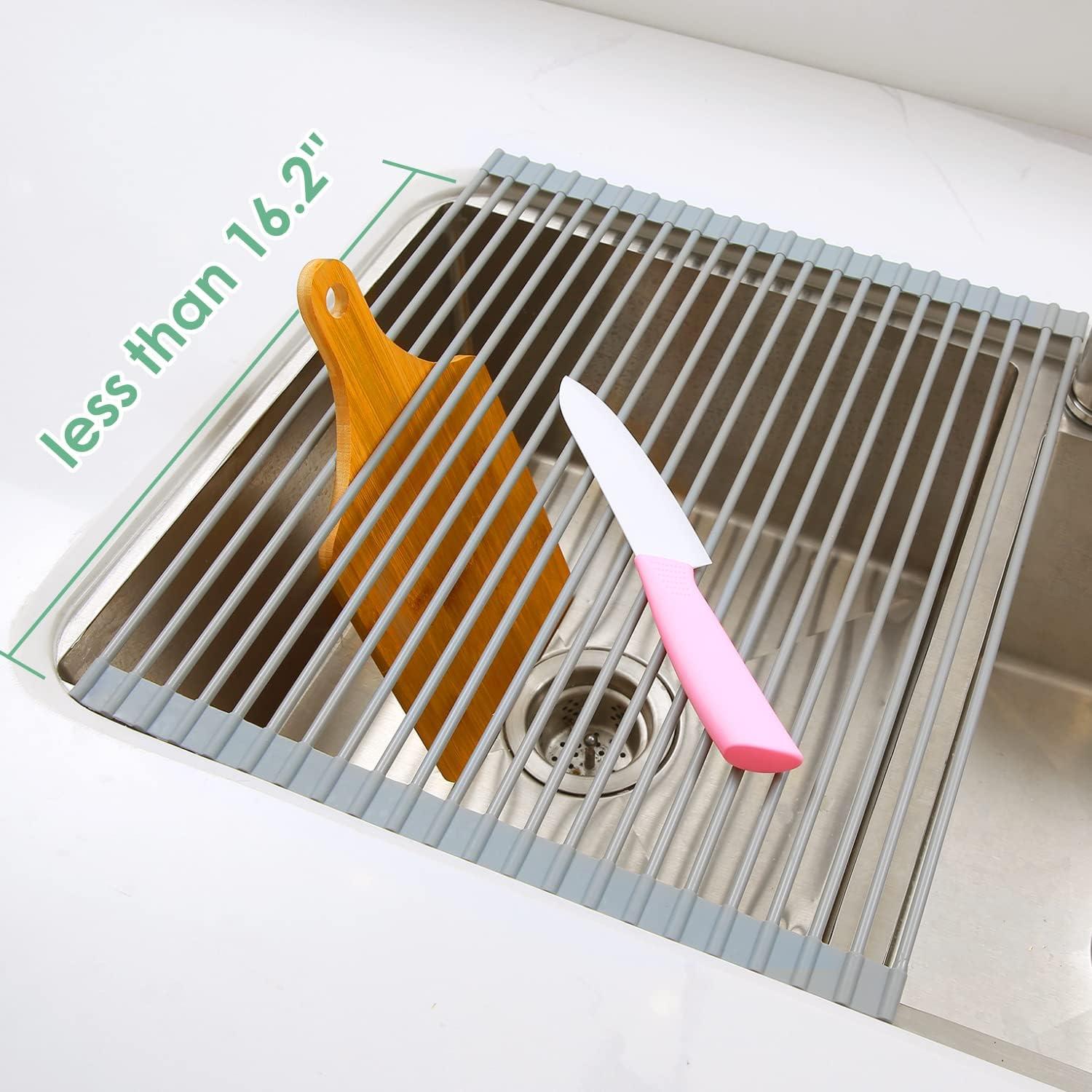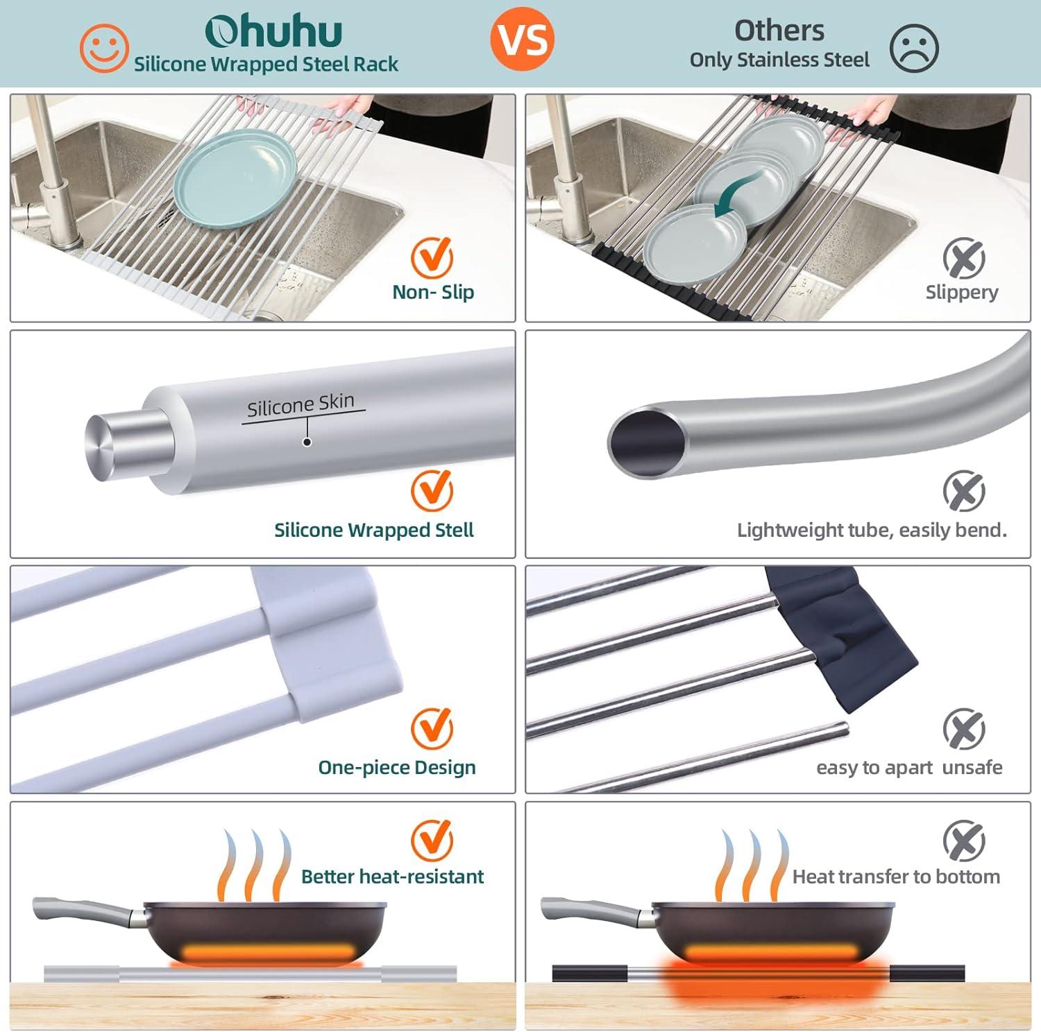 SAVE COUNTER SPACE: Don’t waste precious counter space!The Ohuhu sink drying rack fits right over your basin, providing a thorough dry without taking up room. Once you’re done, roll it up tightly and stick it in your cabinet