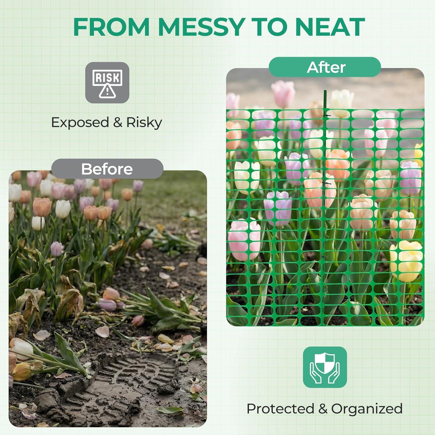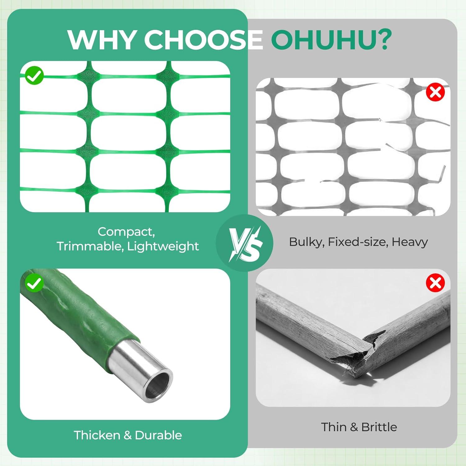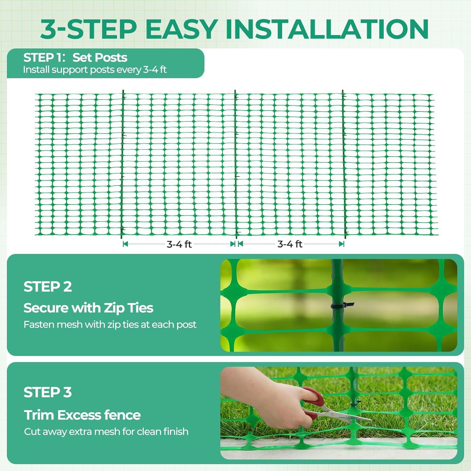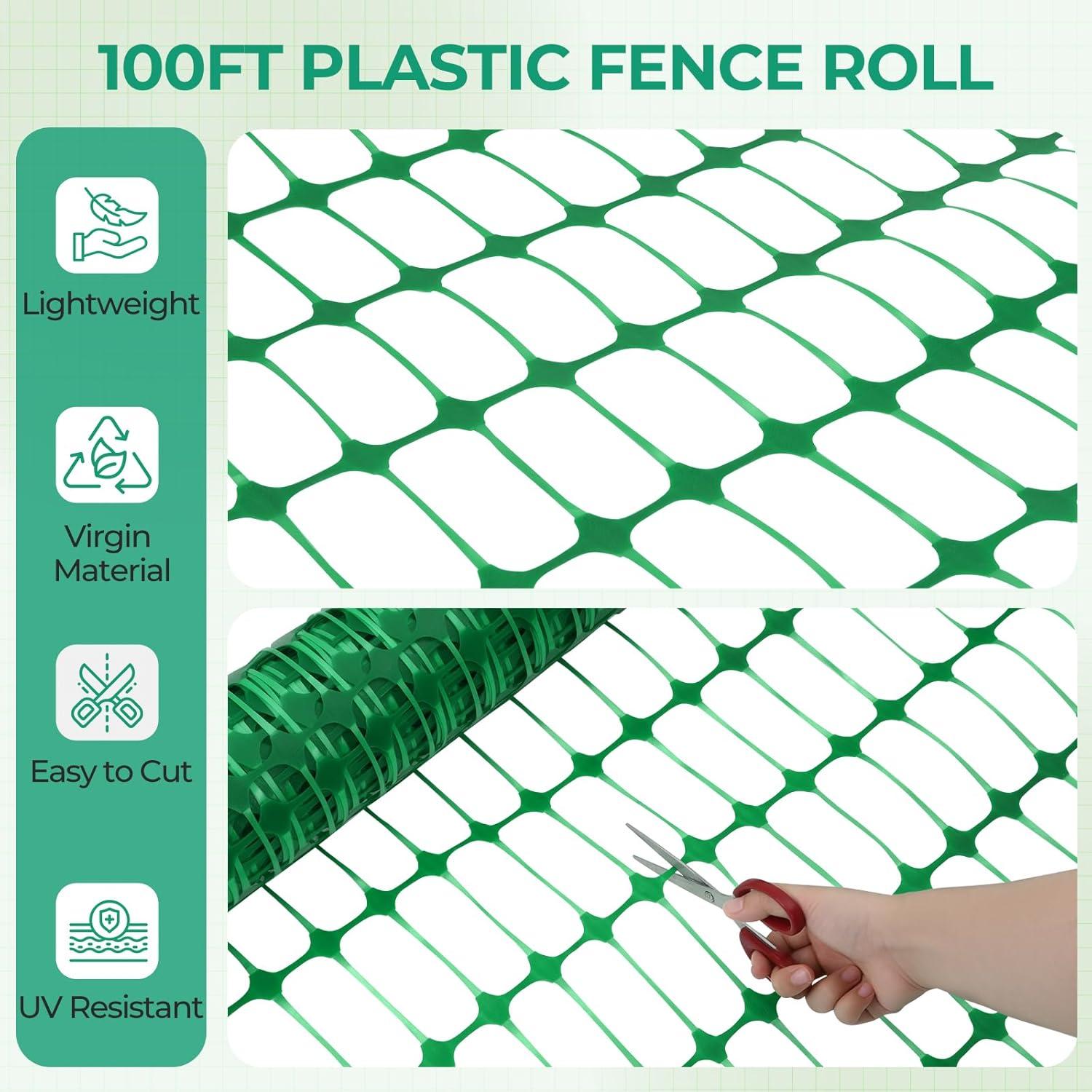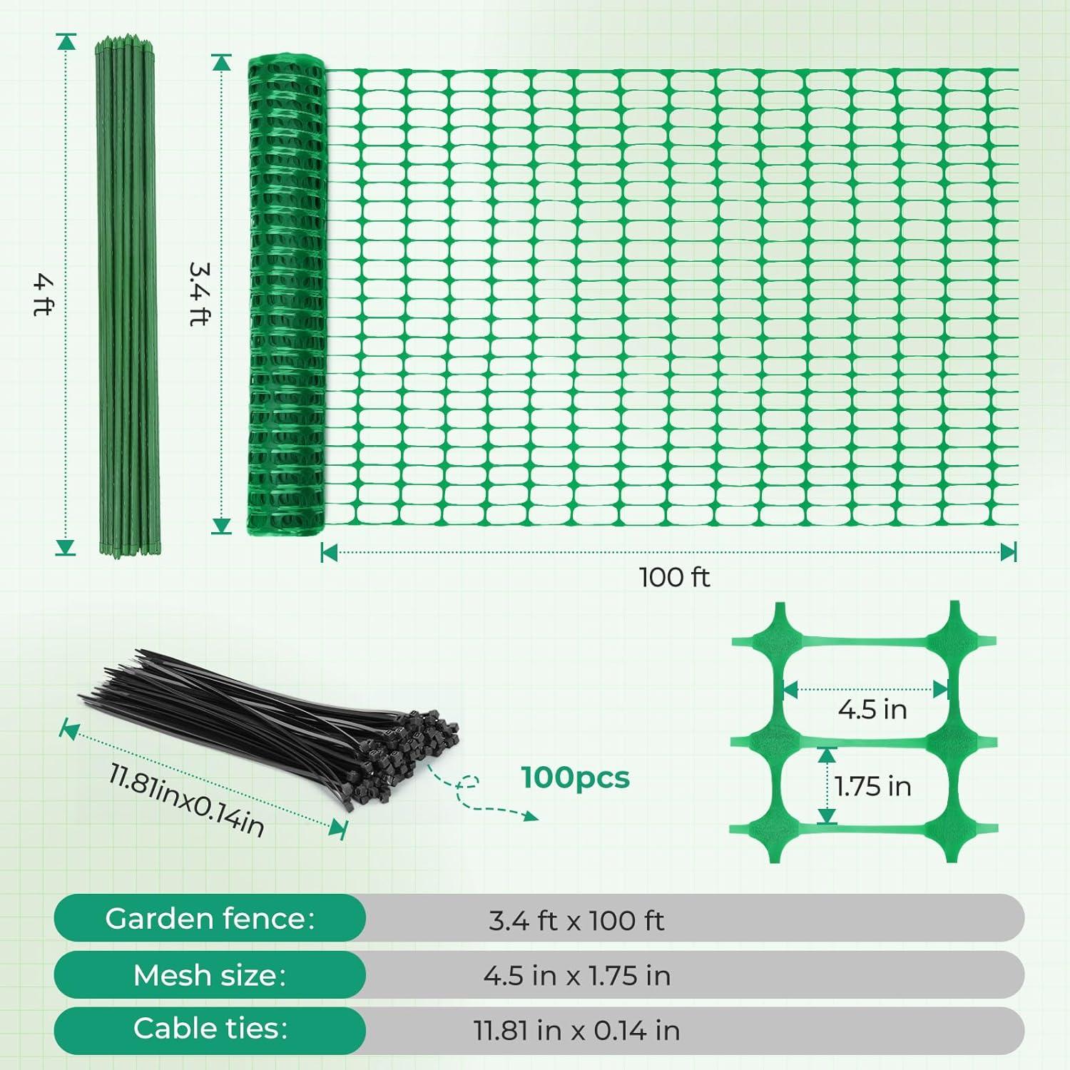 Enliven Your Garden: You've worked long and hard to make your garden as great as it is. Make sure it stays that way with the Ohuhu Green Fence, 3.4 X 100 ft plastic roll that's ready to be set up in whatever configuration you need. The 1.75 x 4.5in mesh openings ensure that there is plenty of airflow and light while keeping out people and animals