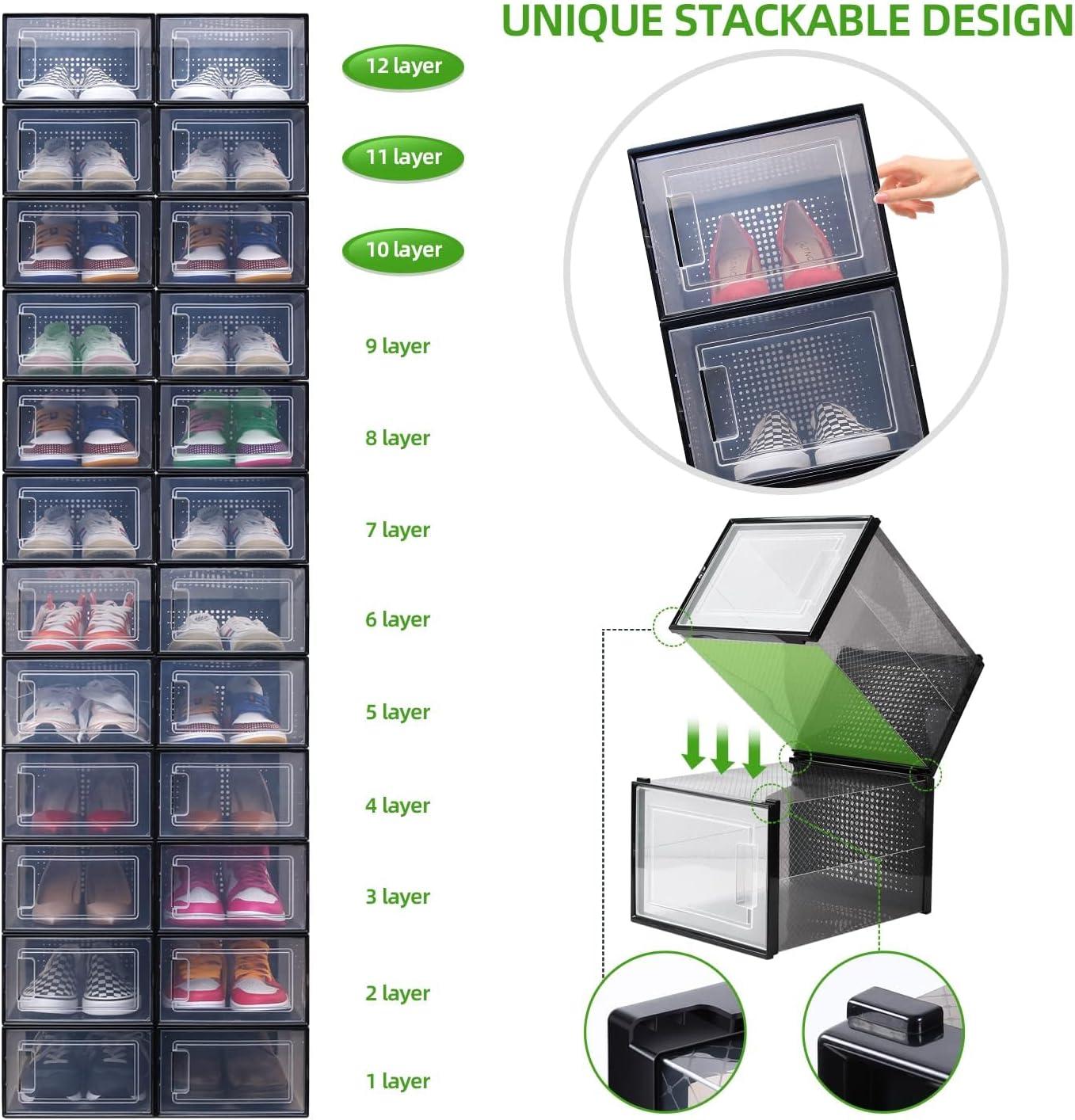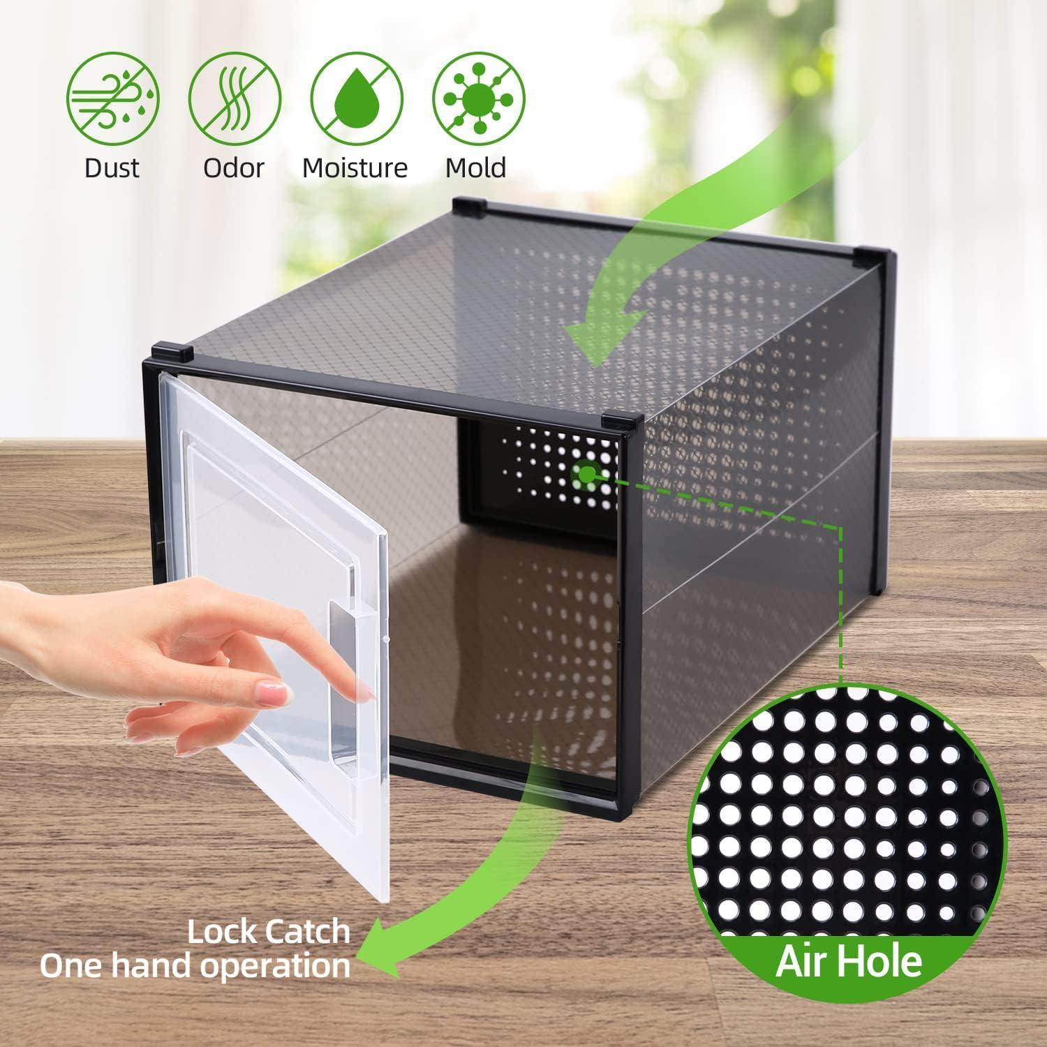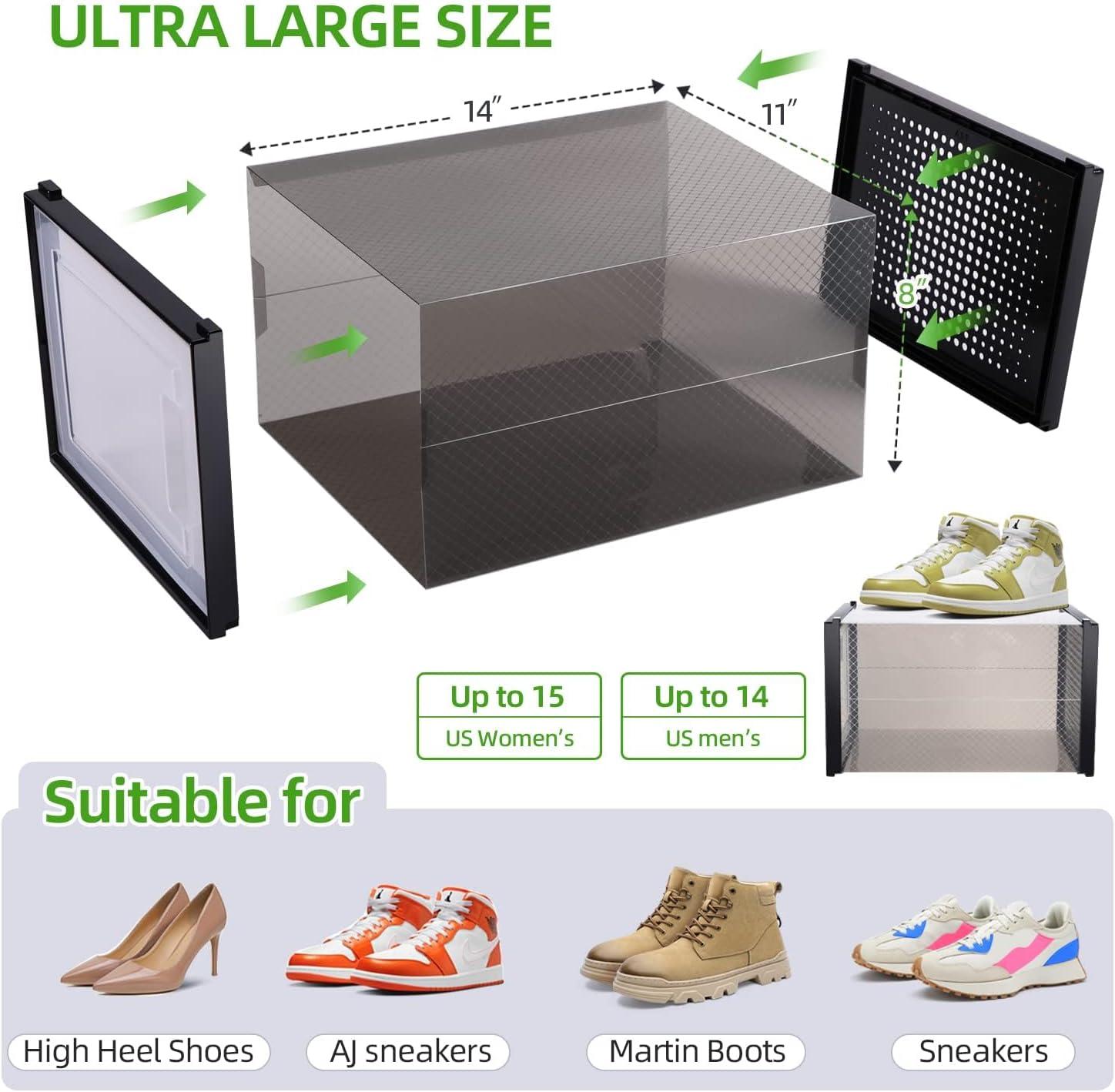 6-PACK ULTRA LARGE SHOE ORGANIZER: If you need to keep your shoes safe, clean and organized, this shoe box is the perfect thing! Measuring 14.2'' (L) x 11'' (W) x 8.3'' (H), these sneaker boxes are large enough to store men's shoes up to size 14, high heels or sneakers for men and women. Keep your place tidy the way it should be. NOTE: The height of shoe case is 8.26 inch, please kindly measure your shoes height before order in case of Not suitable
