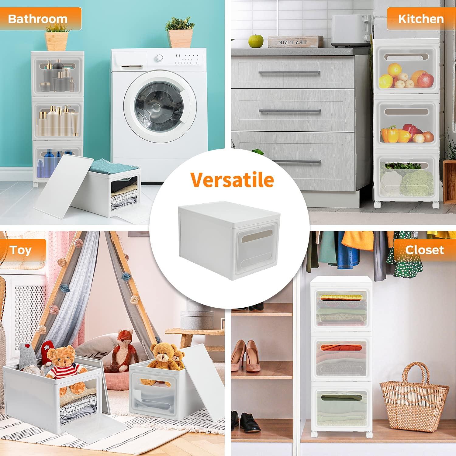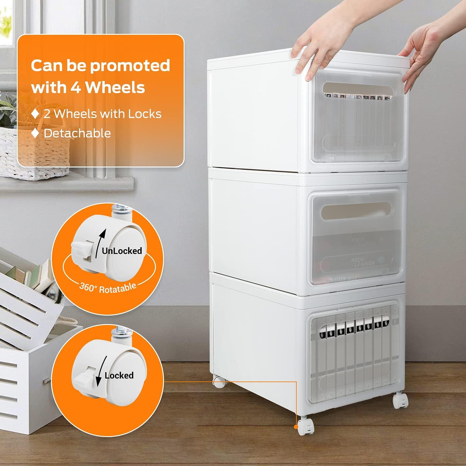 Convenient and Compact: There's nothing more convenient than moveable storage! Freely stack these 3-pack wheeled storage bins in any order or any combination you prefer for maximum flexibility. Plus, the 90-degree angled sides make stacking and packing that much easier.