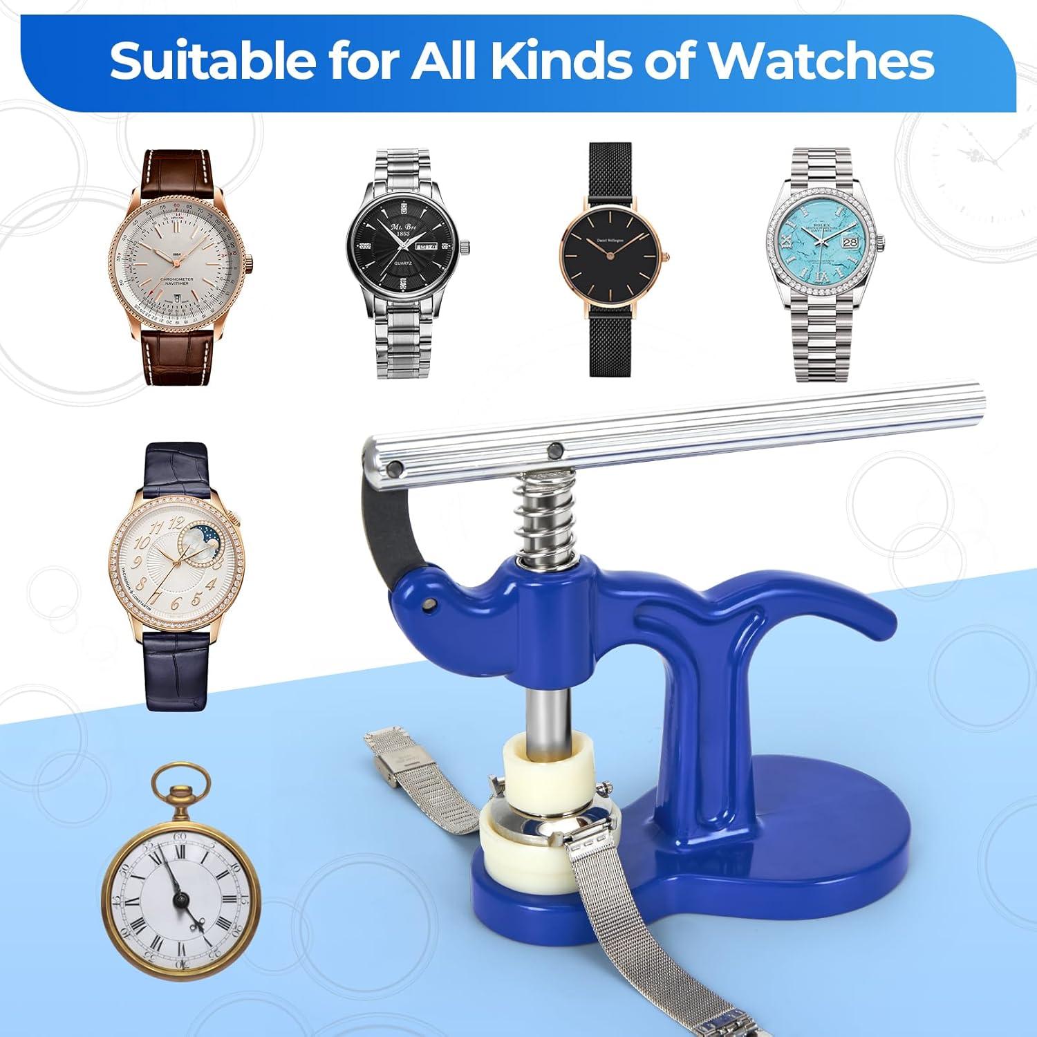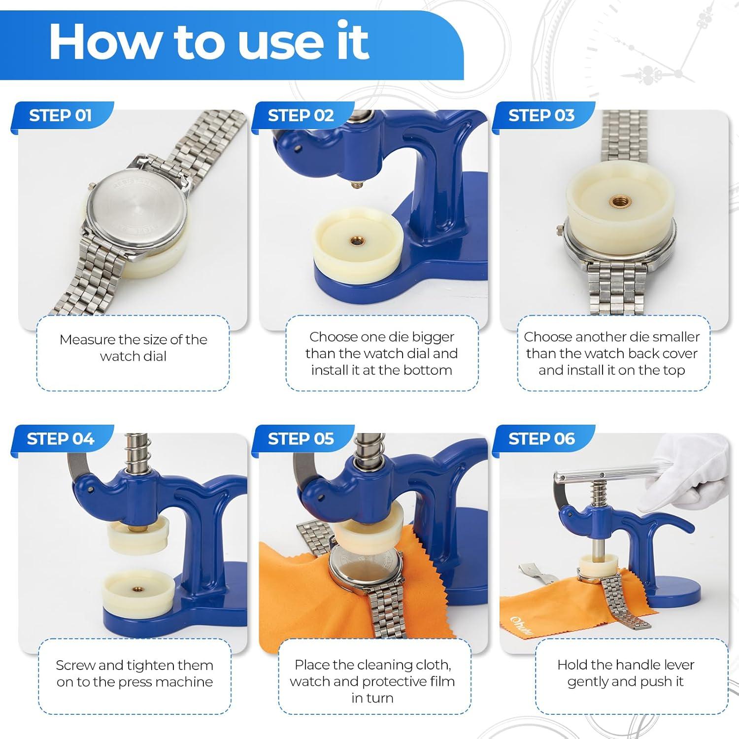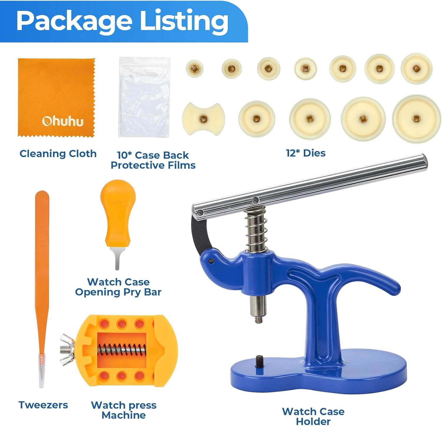 PROFESSIONAL WATCH PRESS SET: Everything you need to repair your watch is now in our Ohuhu watch press tool, which includes a watch press machine, 12 dyes, a cleaning cloth, pair of tweezers, watch case holder, watch opening pry bar, and 10 case back protective films. This set is ideal for both beginners and professional watch repairmen.