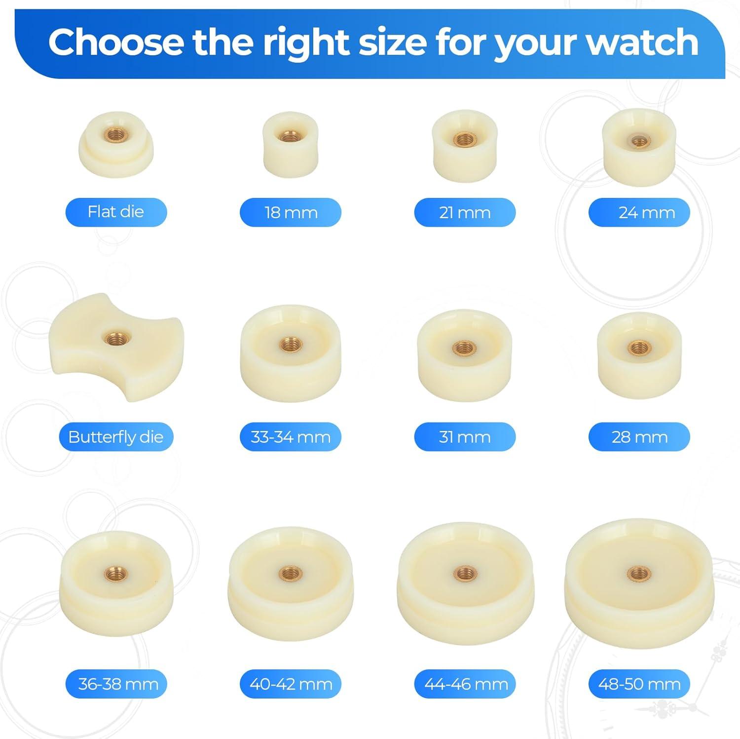 12 INCLUDED DIES: Choose from 12 various dies(flat die/butterfly die/ 18/ 21/ 24/ 28/ 31/ 33-34/ 36-38/ 40-42/ 44-46/ 48-50). Whatever size watch, the solution is here! Our dyes are made of highly wear-resistant ABS and won't cause any scratches to the surface of your watch.