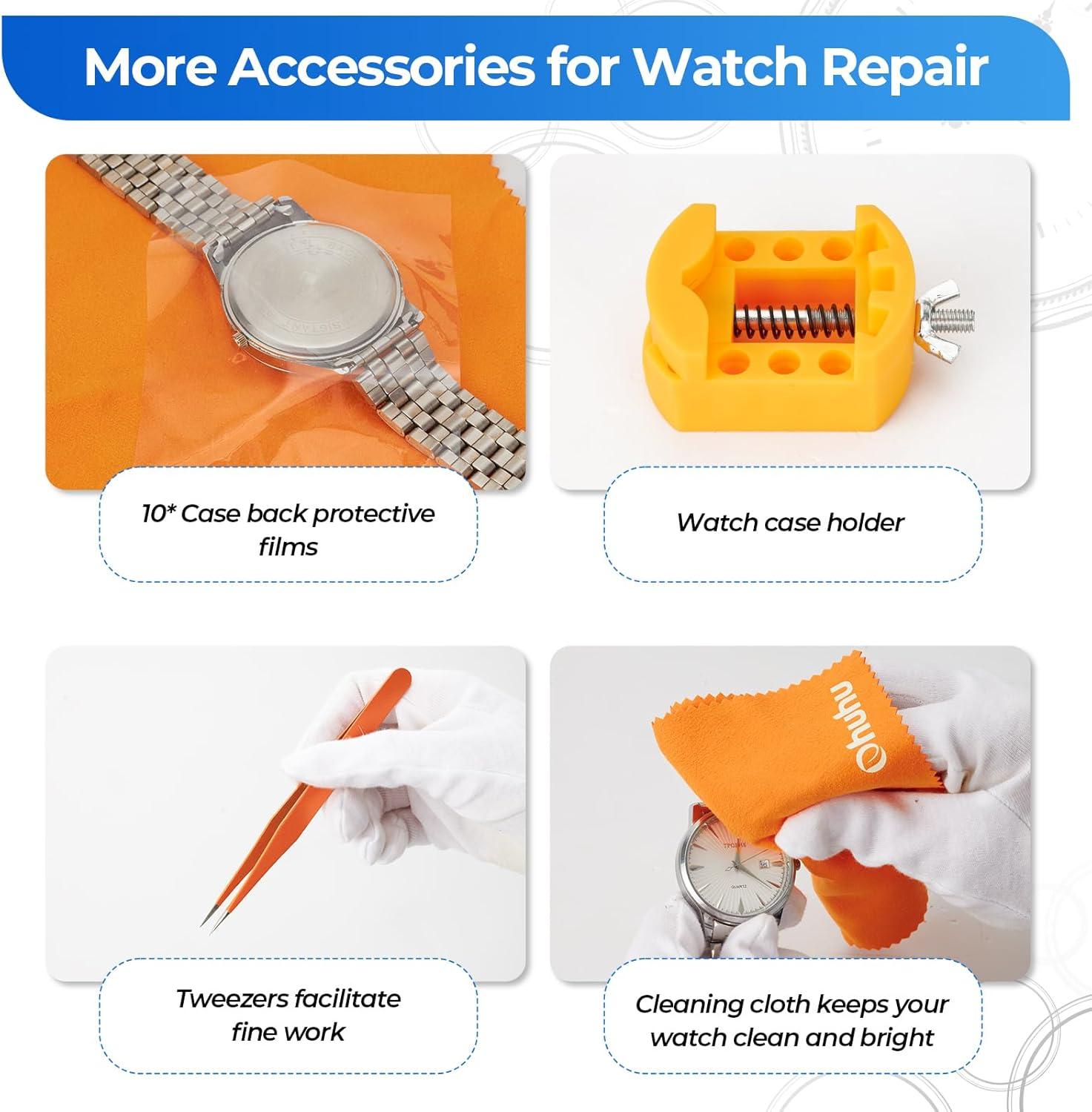 10 BONUS PROTECTIVE FILMSs & 1 UPGRADED PRY BAR: Unlike other kits, our kit comes with ten bonus protective films. When opening the watch case, put the protective film on the dial to avoid scratches. The Ohuhu pry bar is suitable for most snap-off watches and makes it easy to open the watch case.